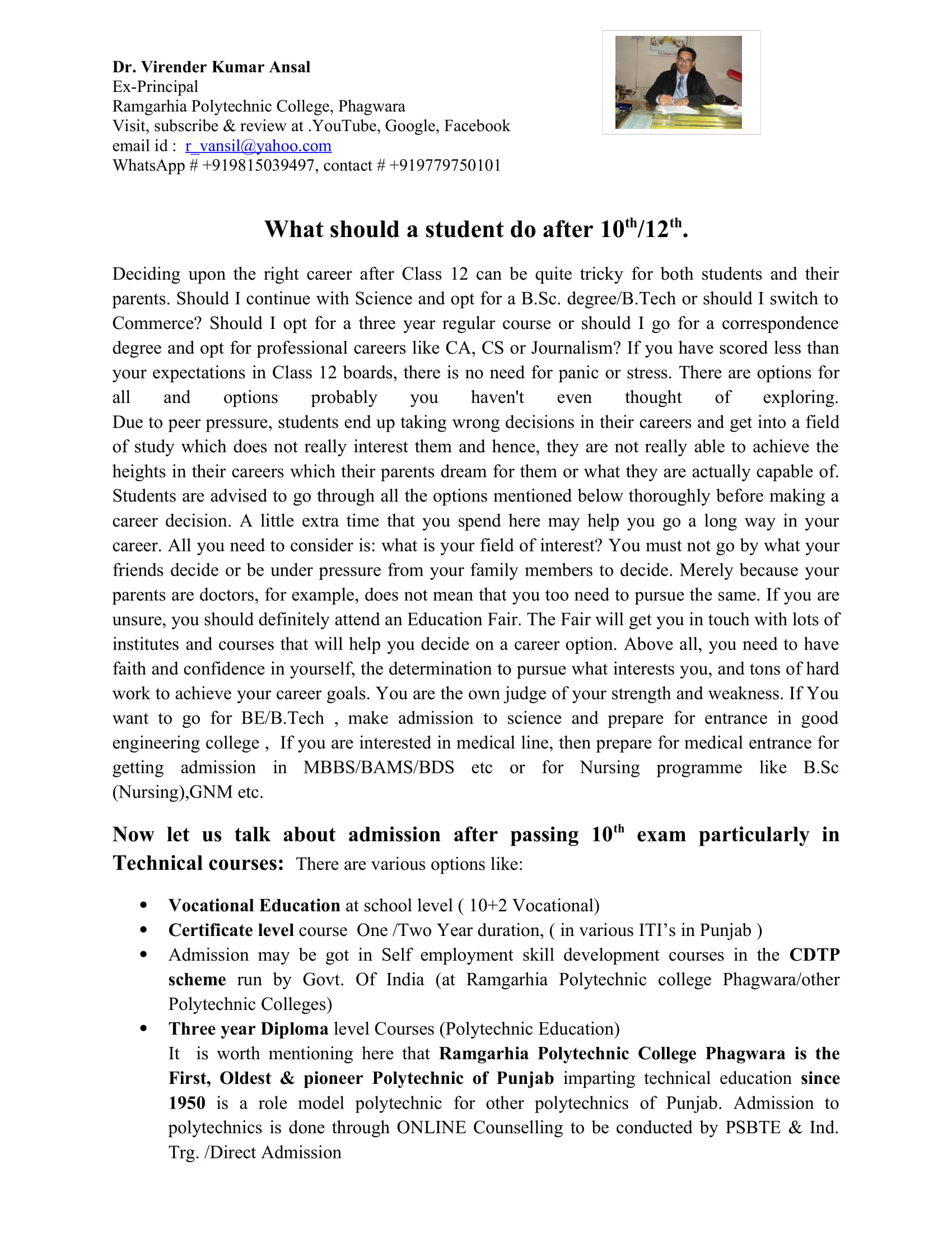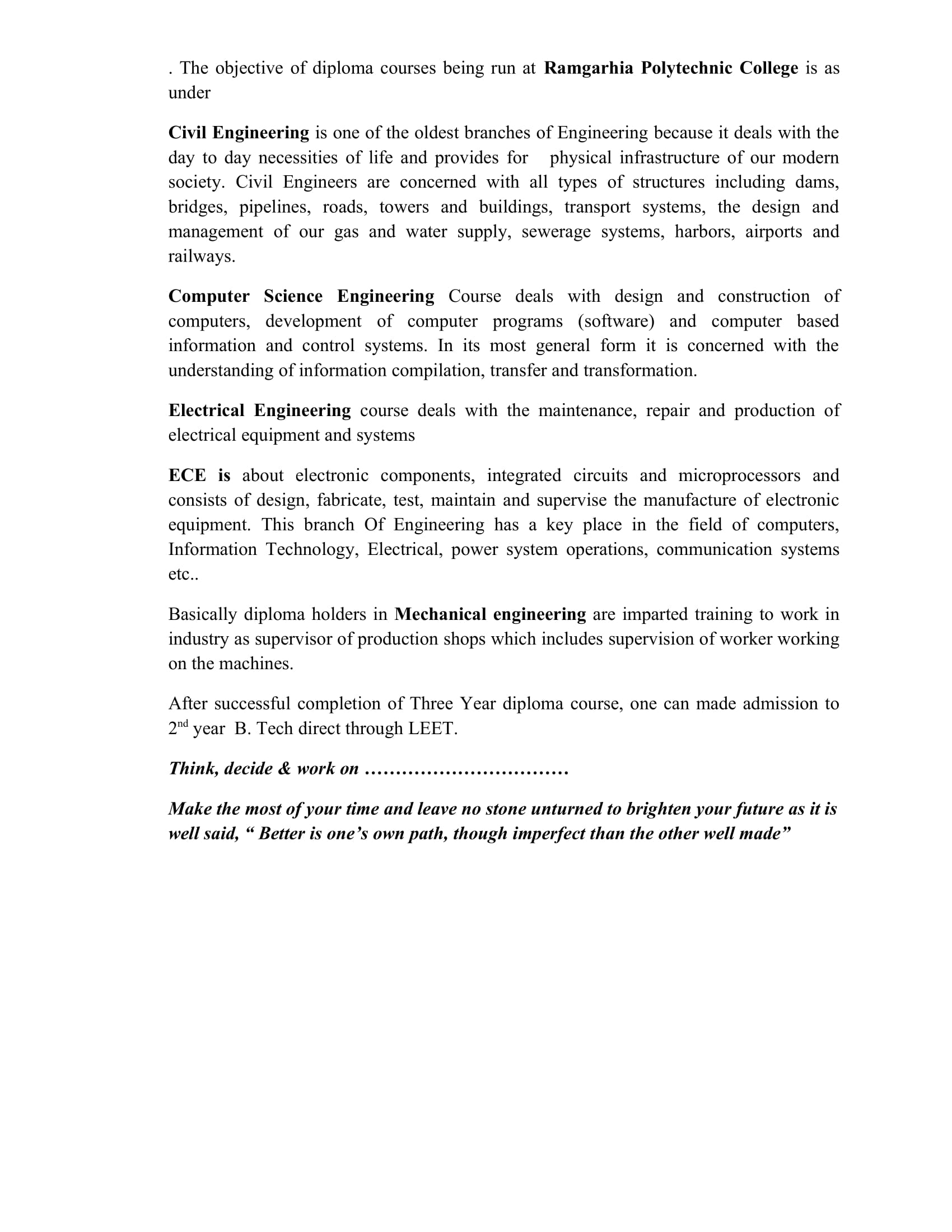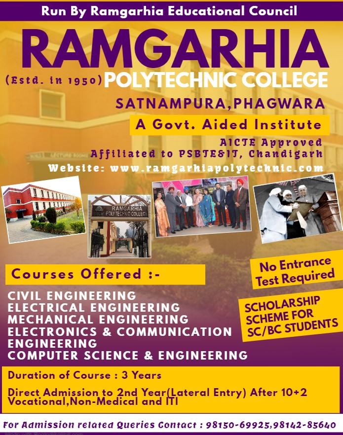 Students which are interested in getting admission in various diploma courses run under this college can provide his/her details as per the the performa. we would contact you and will inform you about the schedule of Admission process 2020. So Please click on the link below containing the Admission Proforma : Click here to fill Admission Proforma 2020-21 Once you submit your details your provisional registraion will be done. Whenever the schedule for Online Registration by PSBTE&IT starts then you will be informed through call or through this website. So you are requested to please keep checking this website for more updates. Thanks and Regards, Principal Ramgarhia Polytechnic College ![]() |